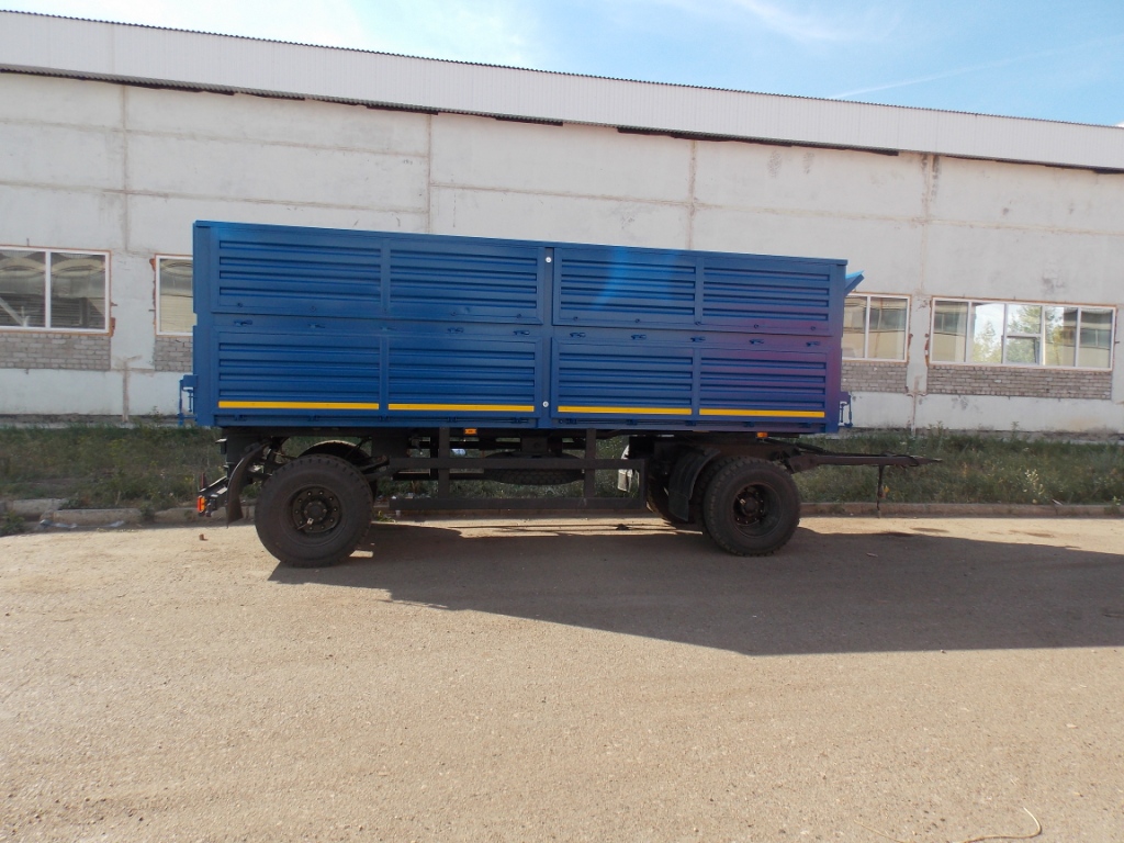 Бортовая платформа стальная, ручное запирание бортов, верхний ряд боковых бортов глухой, нижний ряд боковых бортов стальной подвижный с верхней навеской. Исполнение задней части: с открывающимися бортами с верхней навеской в нижней части ворот, так же возможность по выбору заказчика, установки распашных ворот, люка под зерномет. Пол стальной. Разгрузка на две боковые стороны.